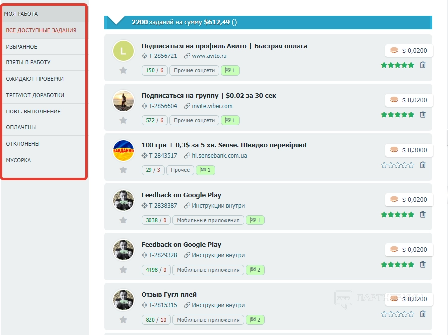 - серфинг — простые задания, для выполнения которых исполнителям нужно серфить по сайтам и выполнять различные действия (подписаться, поставить лайк и т.д.);
