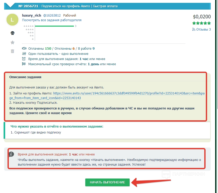 Чтобы взять задание в работу, просто жмем на карточку. Далее откроется форма, где будут изложены подробности выполнения. Особое внимание следует уделить блокам «Описание задания» и «Время для выполнения задания».В конце спускаемся в нижнюю часть экрана и жмем на «Начать выполнение».