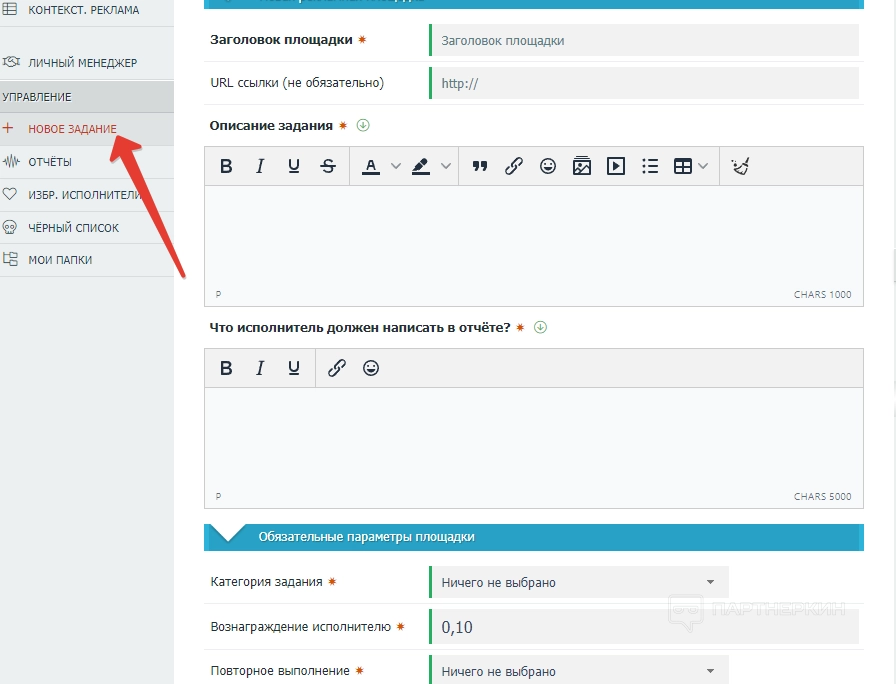 Кликнув на кнопку «Добавить задание», откроется форма, где нужно указать следующие параметры: