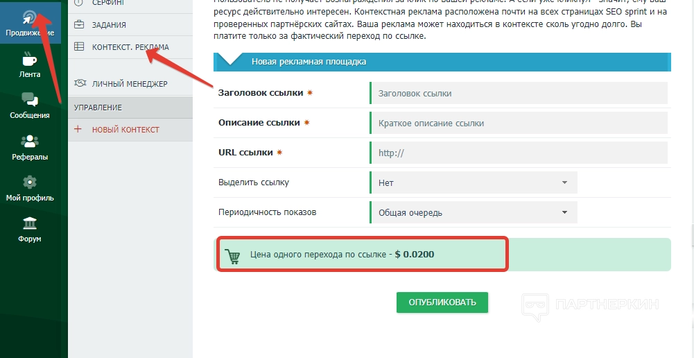 Под формой отобразиться стоимость одного перехода по ссылке.