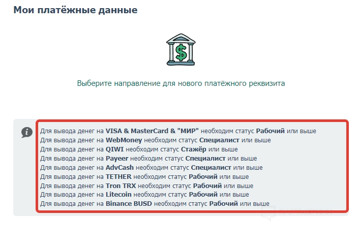 Чтобы пополнить счет, необходимо добавить платежные данные. Способов пополнения много, но для использования хотя бы одного из них вебмастеру потребуется поднять рейтинг. Рейтинг поднимается за счет выполнения заданий.