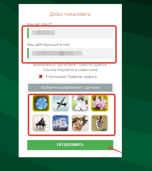 Регистрация проходит быстро. Нужно указать имя и электронную почту, после чего выбрать правильные изображения в рамках проверки на скам. Потом жмем на «Продолжить».