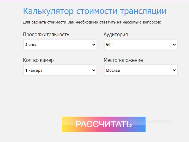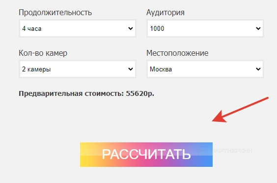 По завершении жмем на «Рассчитать» и ждем завершения подсчета. Если выбрать, например, 4 часа, 1 000 человек и 2 камеры, то стоимость трансляции составит 55 620 рублей.