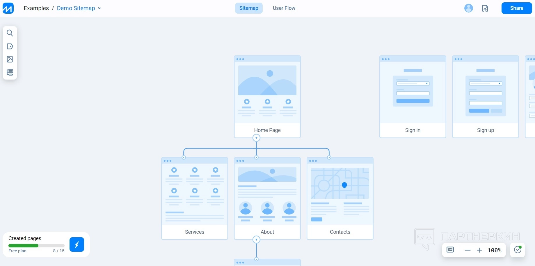 Также есть бесплатный план: он не ограничен во времени, но поддерживает только 1 активный проект не более 15 страниц, 100 Мб места и 3 редактора.