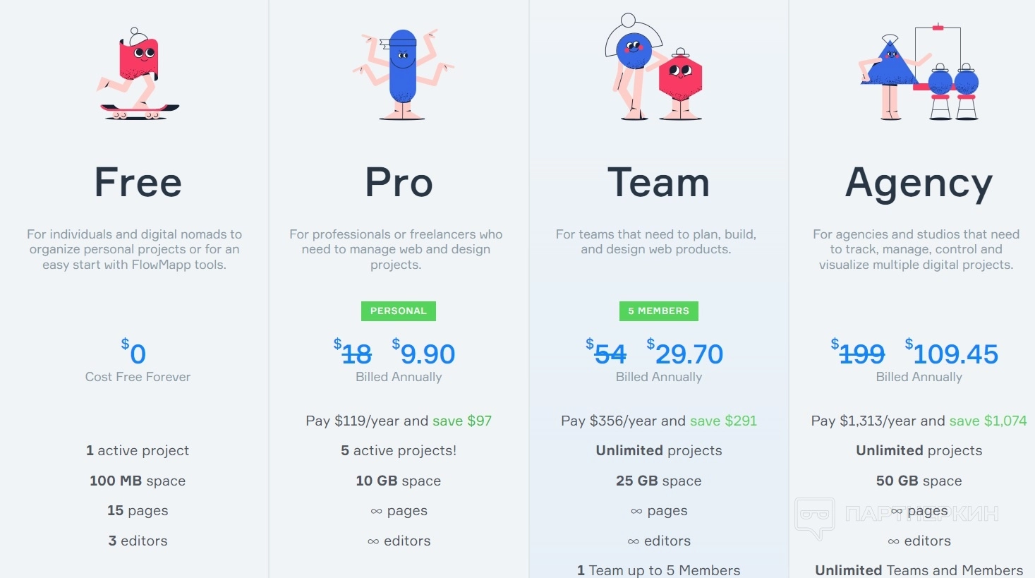- Агентство. Стоит $109,45 / месяц, поддерживает неограниченное количество команд и участников, проектов, страниц, 50 Гб места.