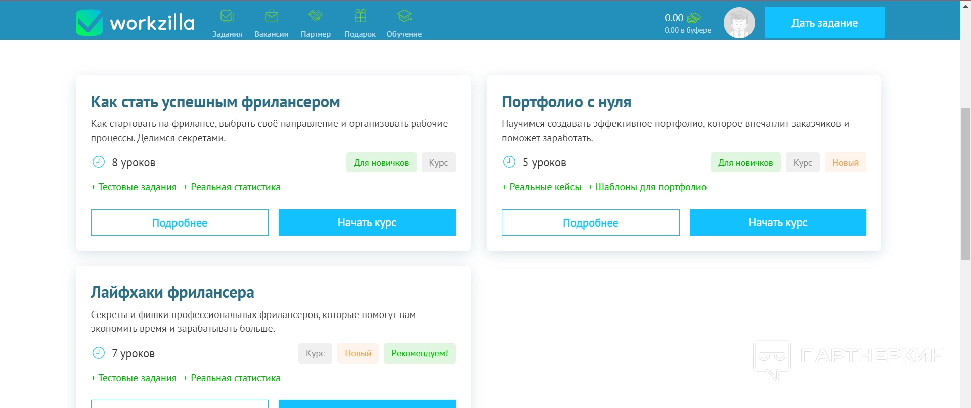 Обучение — этот раздел может быть полезен для новичков-фрилансеров, так как с его помощью можно значительно улучшить свой навык в сфере. Для этого предлагают пройти курс внутри платформы. Всего на выбор предоставляются три курса — это о том, как стать успешным фрилансером, как создать портфолио с нуля, и какие лайфхаки можно использовать в работе.