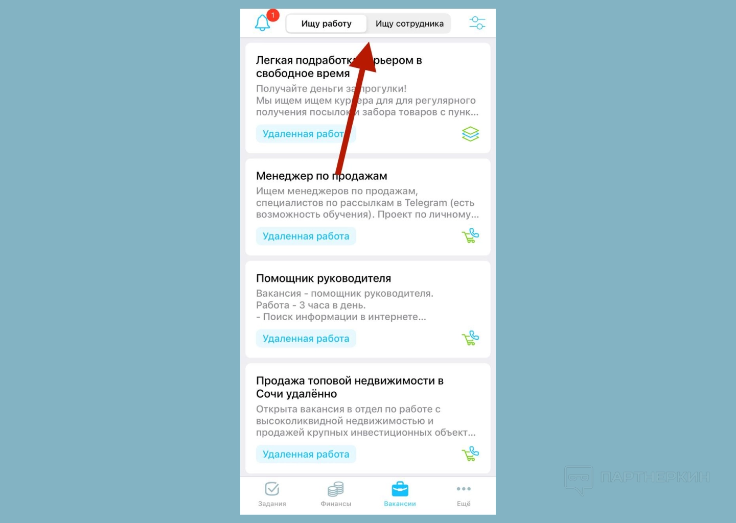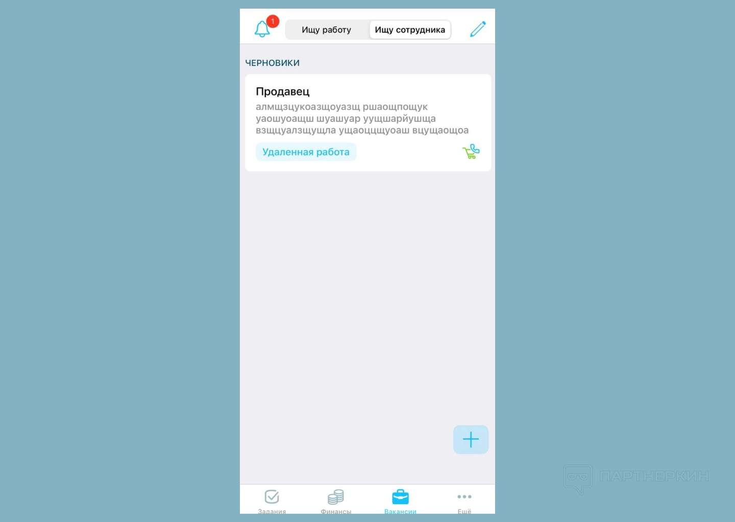 Далее идет раздел с вакансиями — там сразу отображаются все актуальные вакансии для исполнителей. Также есть отдельный пункт сразу и для заказчиков под названием «Ищу сотрудника» — там показываются актуальные объявления о найме от пользователя и черновики вакансий.
