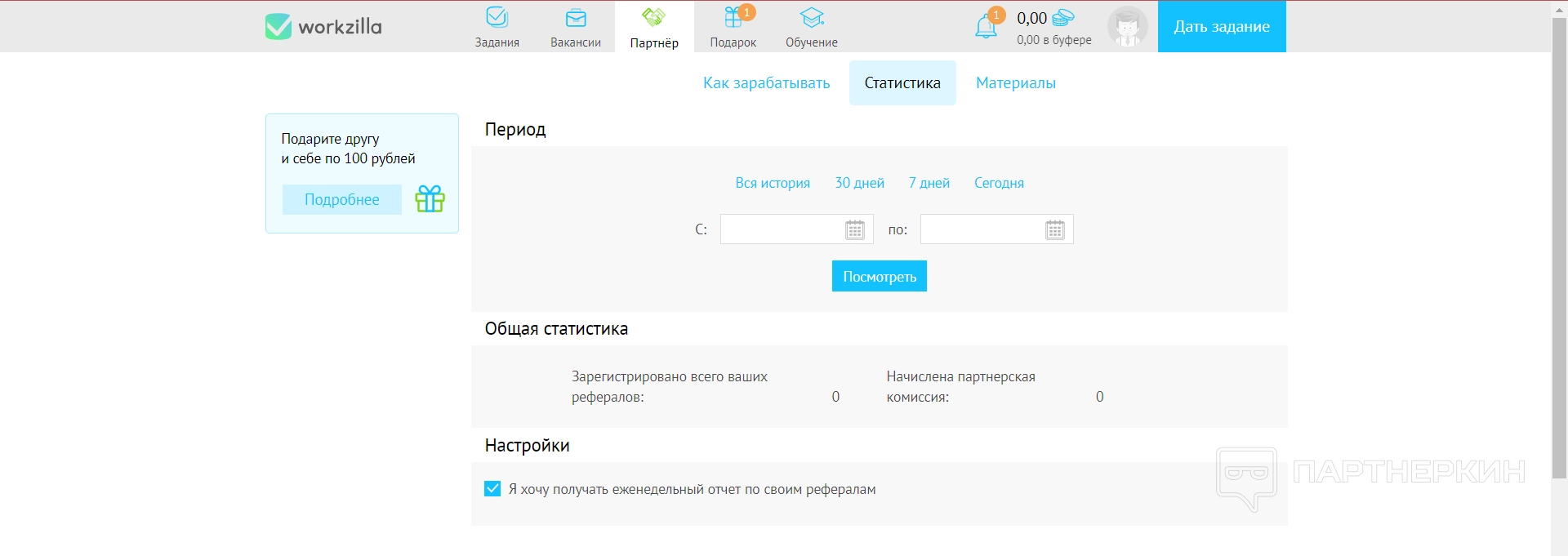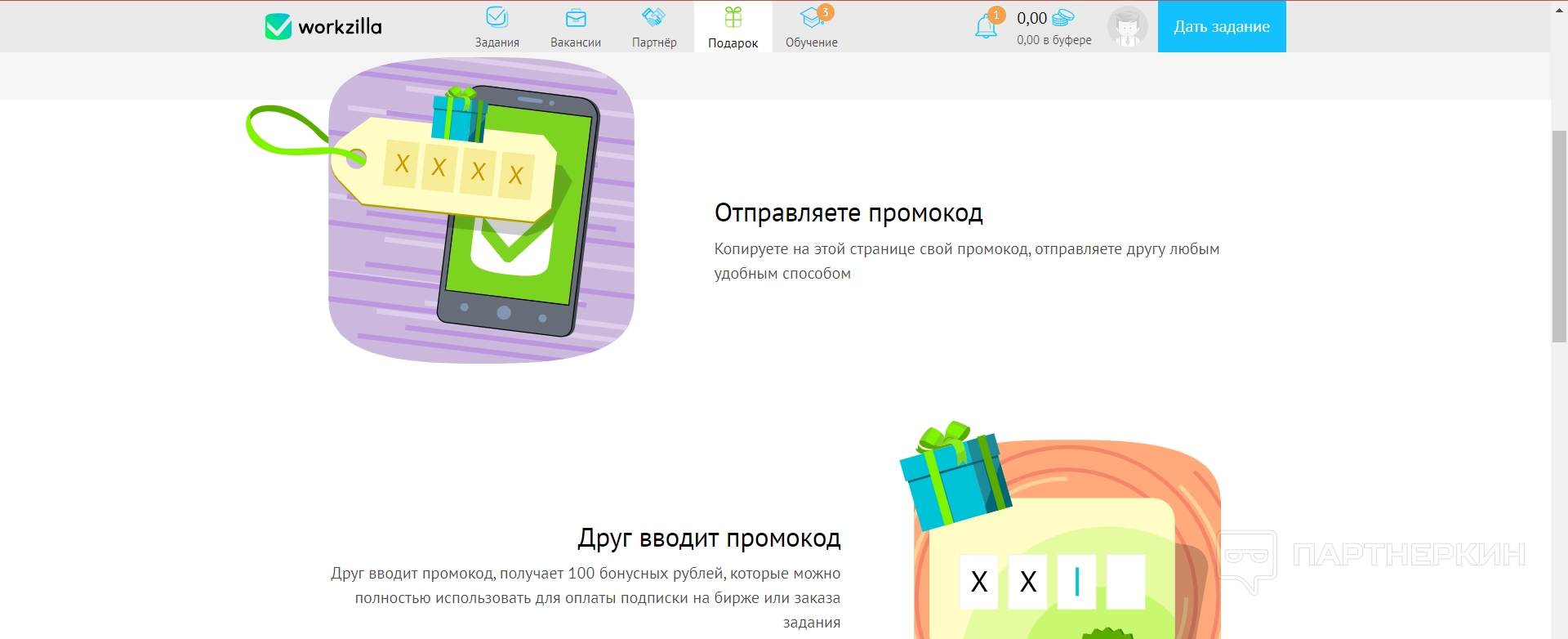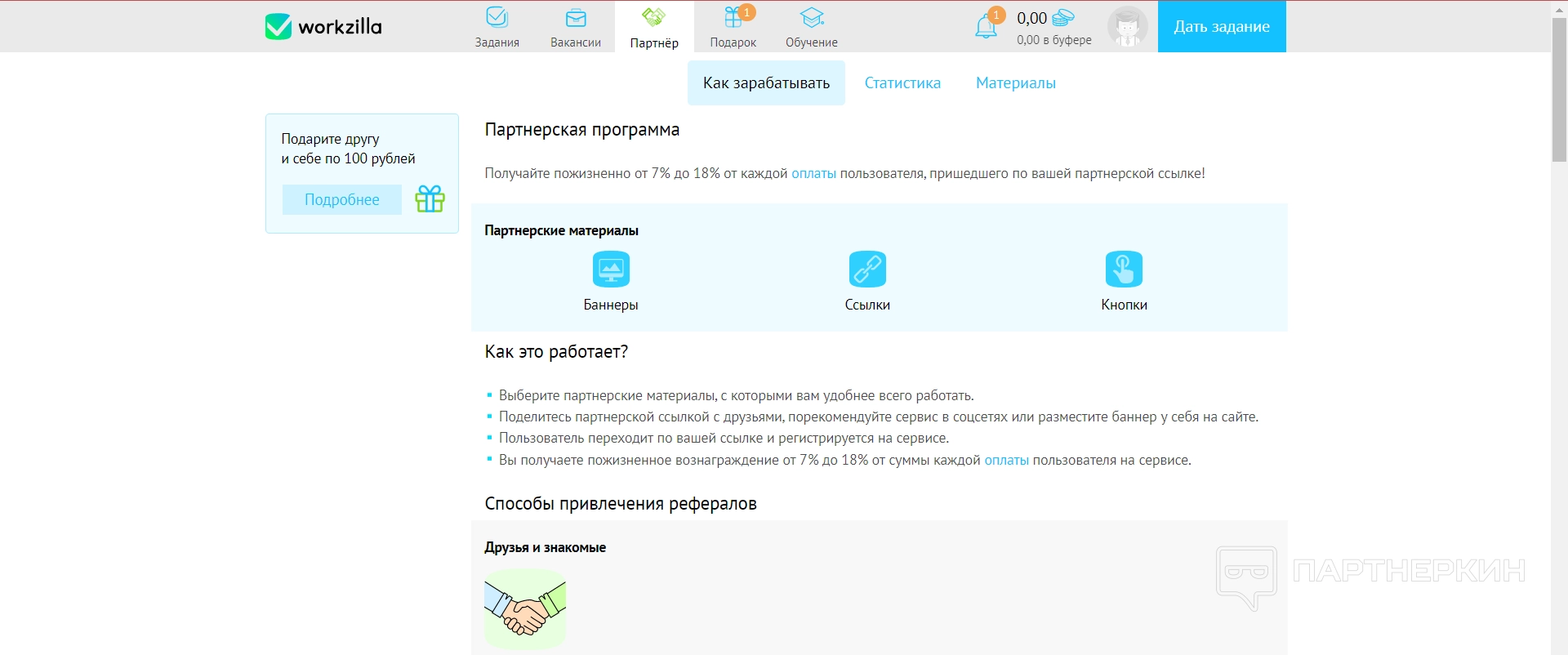 Партнер — этот раздел помогает дополнительно заработать. Здесь можно поучаствовать в реферальной программе. Вознаграждение будет приходить за каждого приглашенного пользователя, который совершает оплату подписки на сервисе. Процент составляет порядка 7-18%.