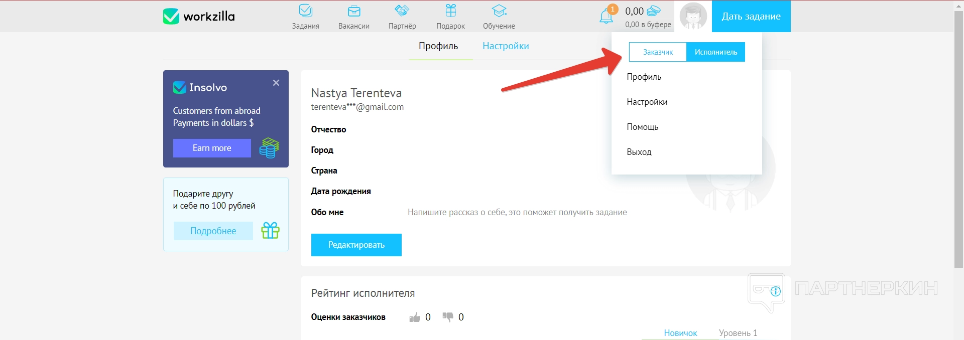 Чтобы использовать платформу в качестве заказчика, можно либо заново зарегистрироваться на платформе, либо просто переключится в режим заказчика — делается это через то же окно, что ведет в личные настройки пользователя.