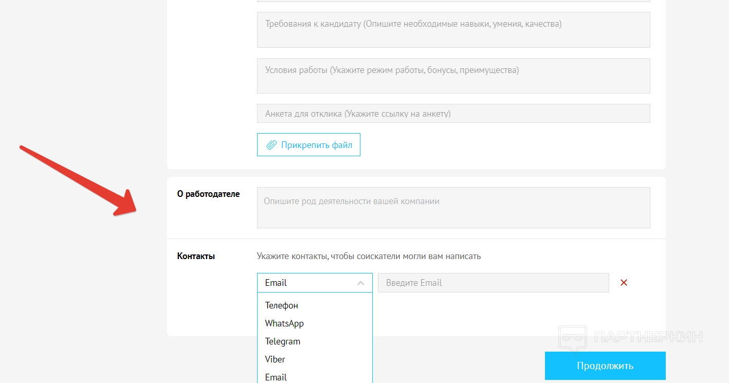 Далее заказчик может ввести описание своей вакансии — это тоже крайне важный пункт, так как именно с его помощью пользователи будут решать, подходит ли им предложение или нет. Поэтому рекомендуем подробно все расписать — что за компания, какая работа предстоит, какие навыки и знания нужны, будет ли тестовое и так далее. То есть важно ответить на хотя бы минимальные вопросы потенциального исполнителя. Для удобства описание поделили как раз на такие пункты — требования, обязанности, условия работы и анкета. Анкета необходима для того, чтобы пользователь оставил свои данные и информацию о себе. Но можно вполне обойтись и без нее — просто оставить контакты и через переписку узнать все у исполнителя.