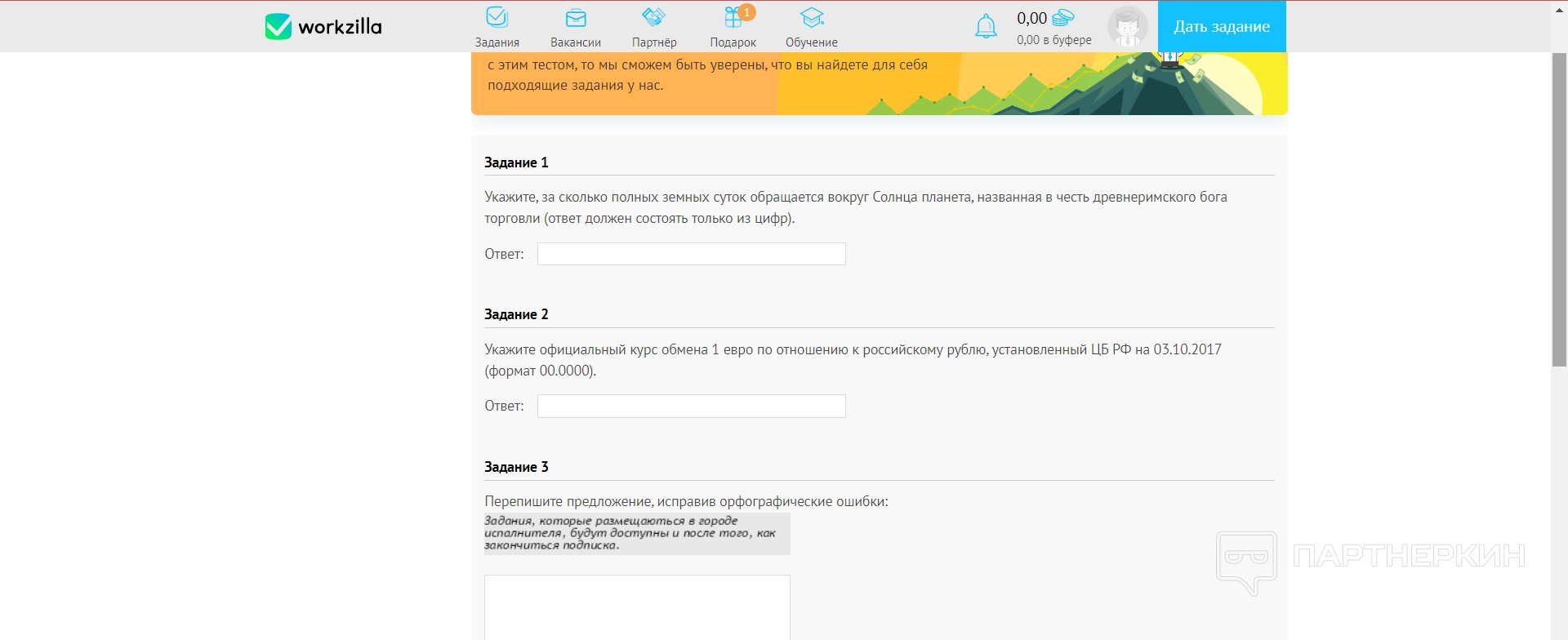Для работы пользователю лучше сначала пройти тестирование — это поможет поднять свой уровень на платформе в глазах заказчиков. Тестирование включает четыре задания — они представлены в виде вопросов, на которые нужно дать ответ. После этого пользователь может проверить их, и результат отобразится на странице.