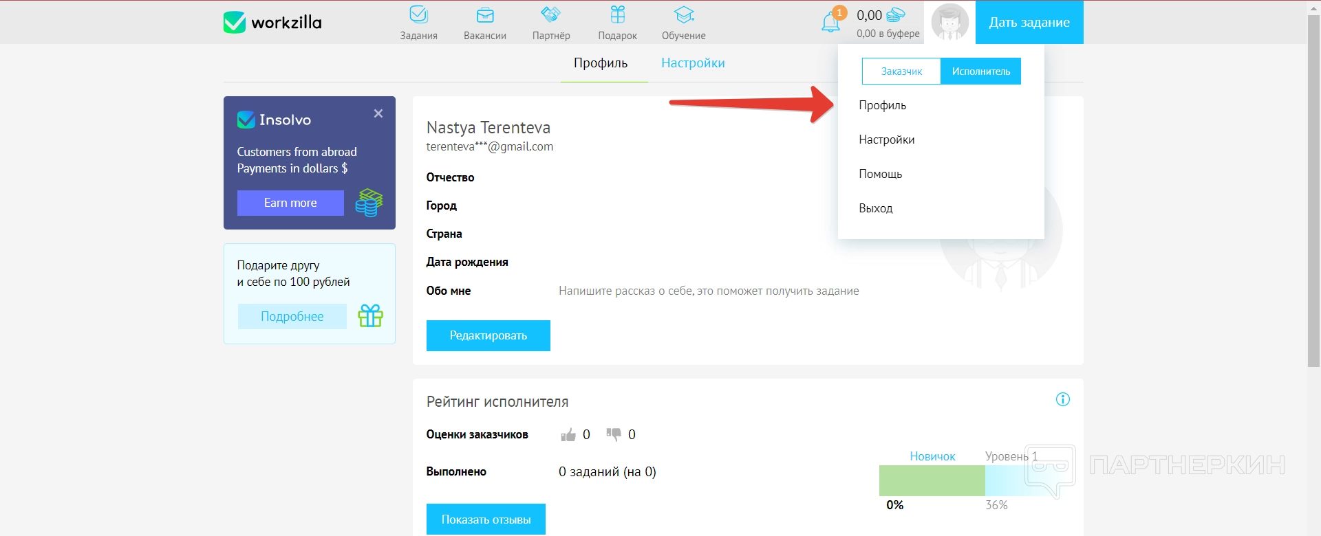 Чтобы легче находить работу и получать одобрение, важно заполнить свой профиль информацией. Для этого нужно тапнуть по картинке с аватаркой профиля и выбрать раздел «Профиль».