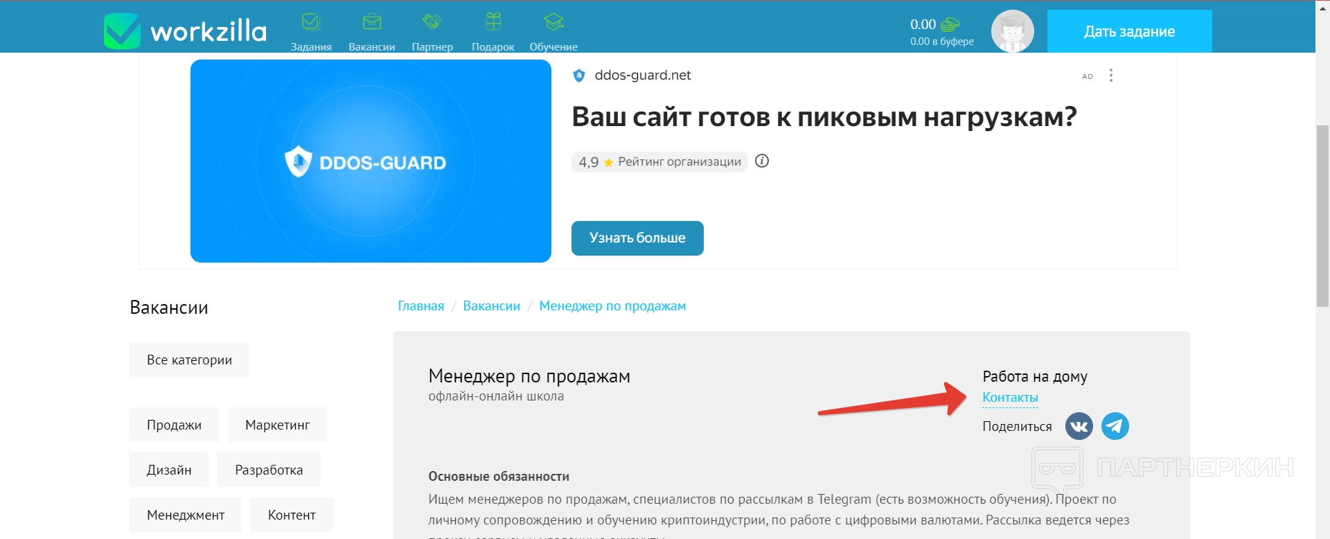 Если пользователь ищет постоянную работу, то ему подписку оплачивать необязательно— данные из вакансий доступны каждому. Достаточно просто открыть нужный вариант, почитать описание и условия. Если понравится, то есть кнопка «Контакты» — ее можно нажать и узнать, как связаться с работодателем.