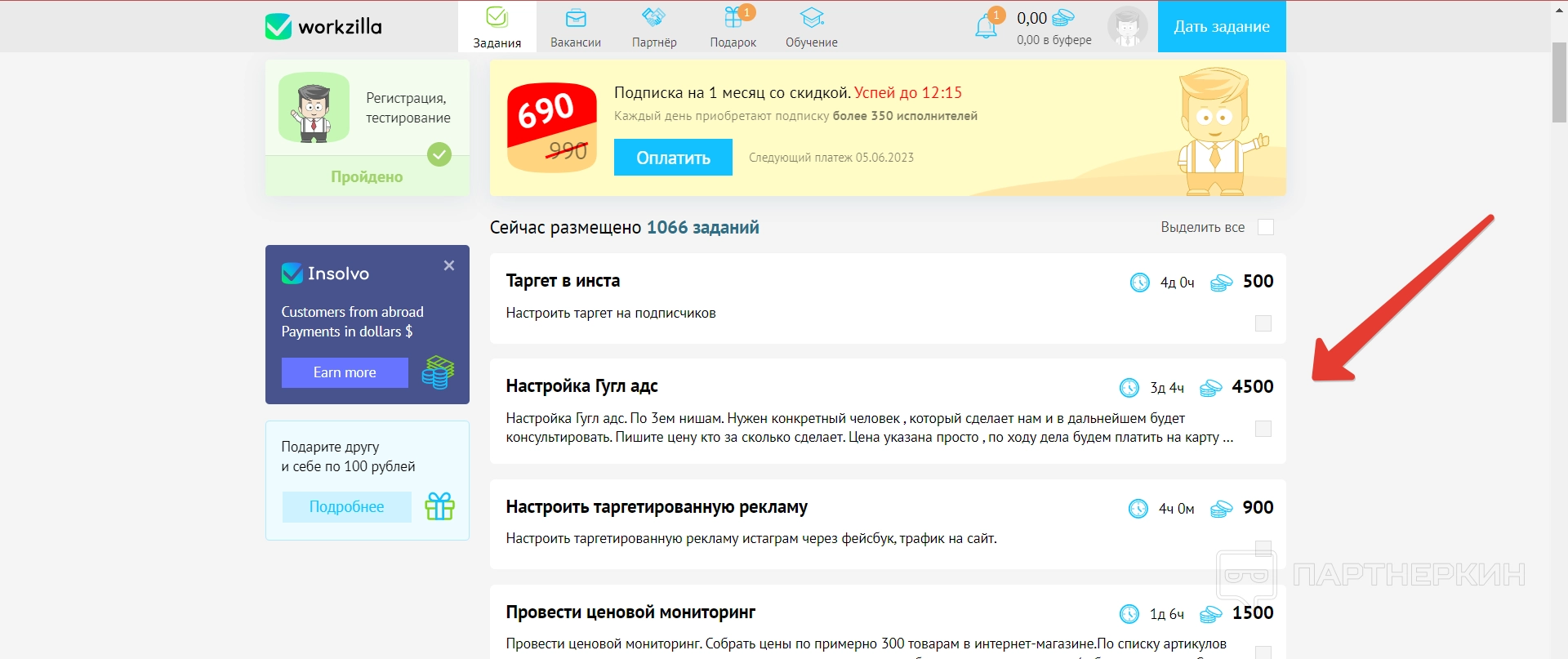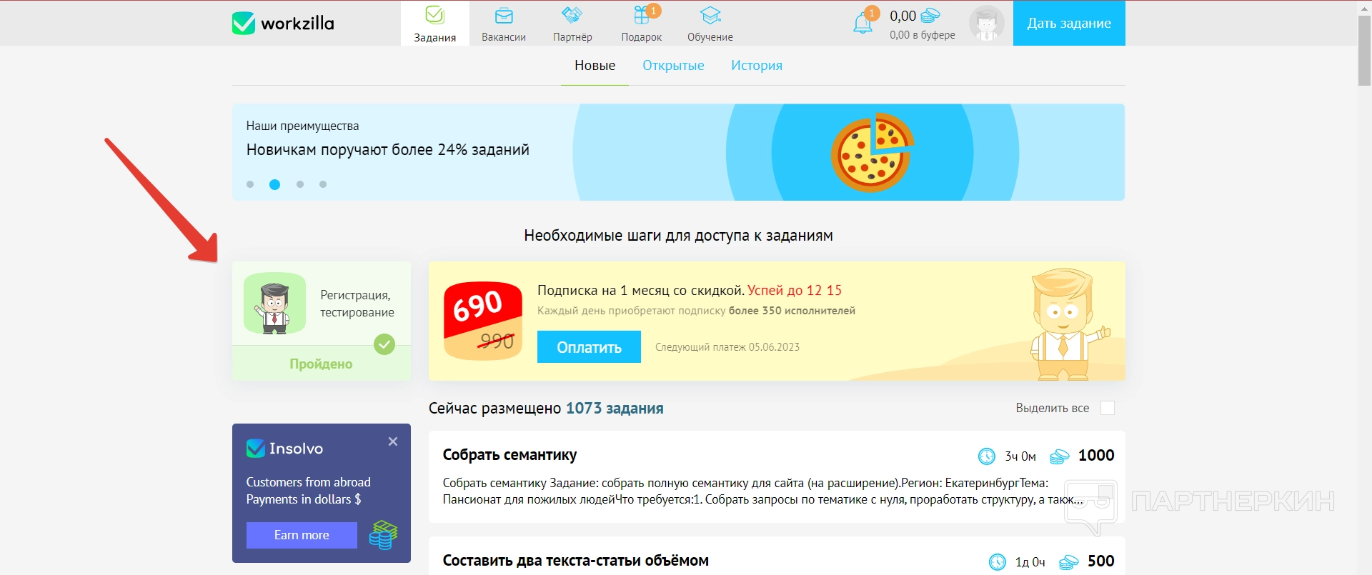 Сразу взять задание не получится — для этого пользователь должен сначала оплатить подписку на сервис. Сразу же после будет доступен выбор заданий.