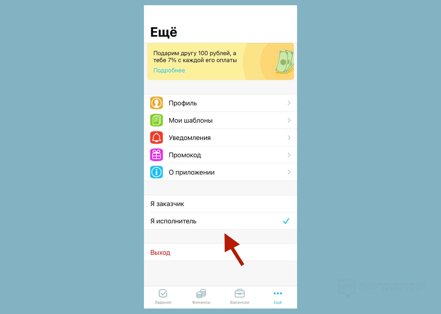 В заключительном разделе «Еще» пользователь может просматривать данные своего профиля, собственные шаблоны для отклика на вакансии, причем в вебе нет такой функции, а также уведомления, промокод и информация о приложении. Здесь же исполнитель может переключиться на заказчика.