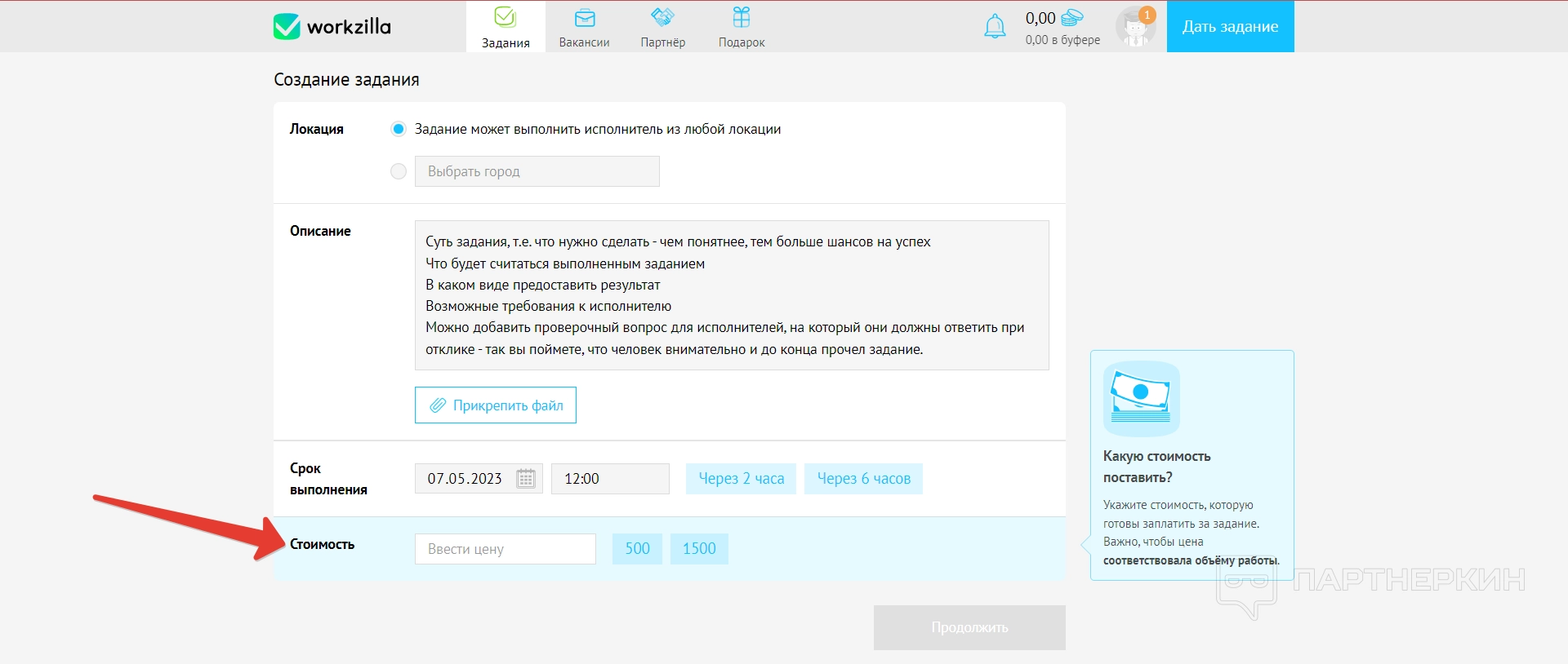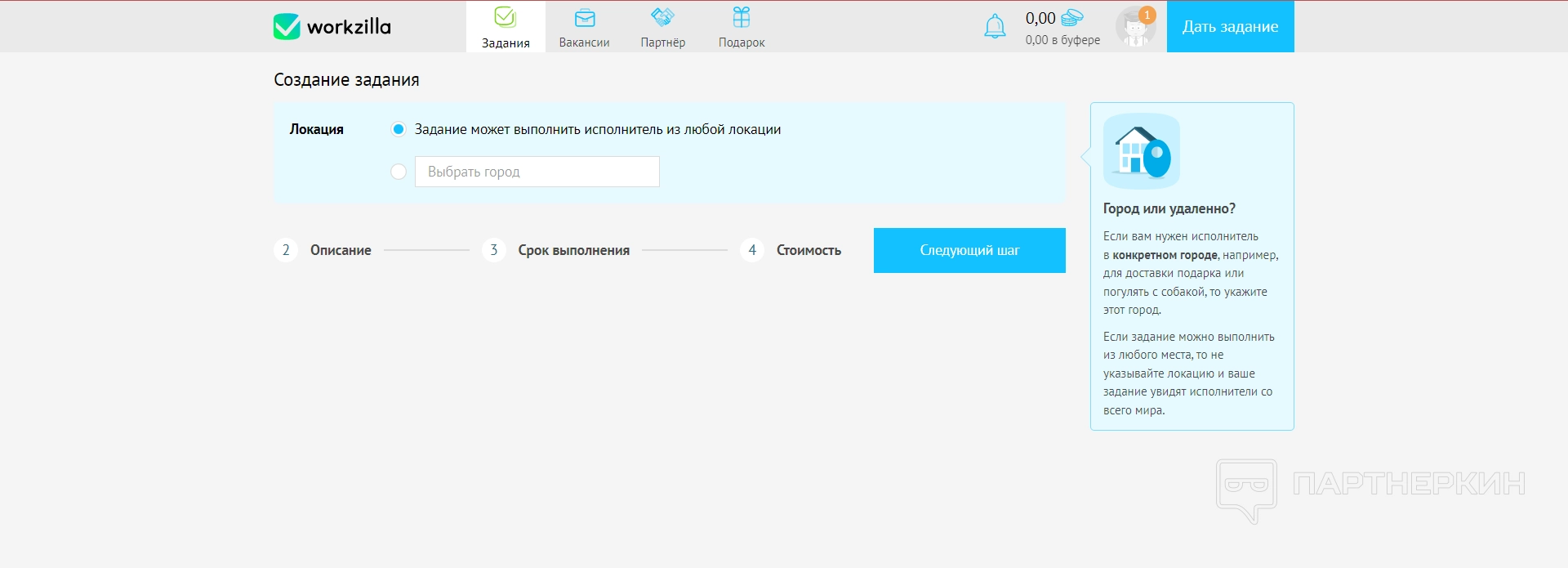 Первым шагом в создании будет настройка локации — можно указать, что задание подходит для исполнителя с любым местом жительства, а можно ввести конкретный город или страну, если работа будет проходить не в онлайне, например.