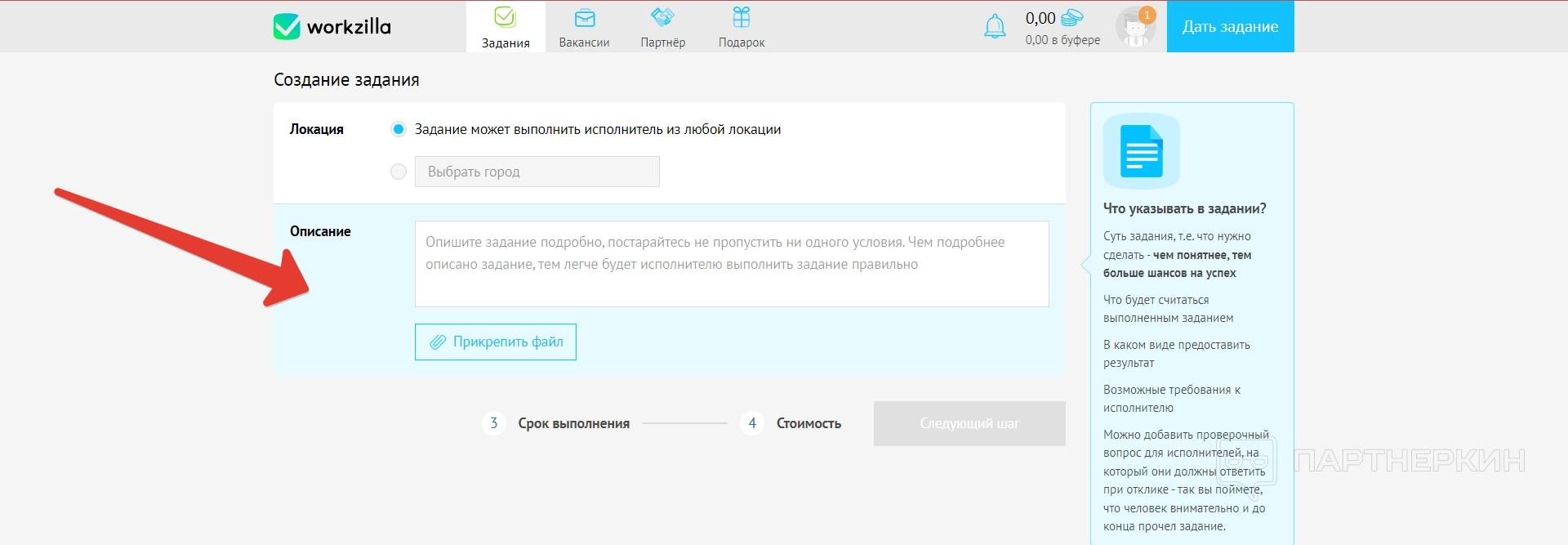 Следующий этап настройки включает добавление описания к своему заданию — это крайне важный пункт, так как именно в зависимости от написания задание либо выберут, либо перелистнут. Также здесь можно прикрепить файл с более подробным описанием — например, если есть конкретное техническое задание, можно сразу его приложить, чтобы исполнитель примерно понимал, за что ему придется браться.