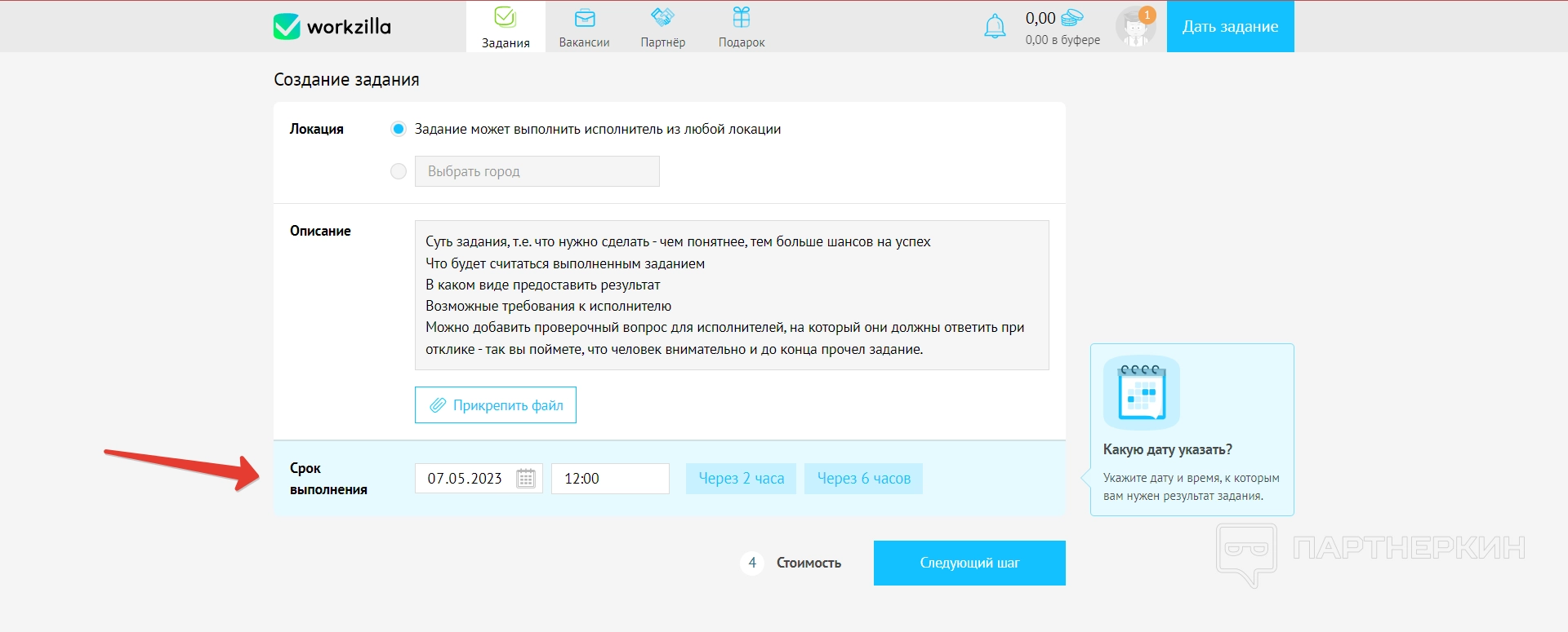 Как только описание будет добавлено, кнопка следующего шага станет активной — пользователь сможет перейти в следующий пункт настроек и указать примерные сроки выполнения своего задания. Можно указывать период в датах, — например, два или три дня — а также можно сразу отметить дедлайн в часах — скажем, два часа или шесть. Важно не ставить слишком жесткие рамки в плане сроков, если задание невозможно выполнить за это время, — зачастую такие предложения не берут.