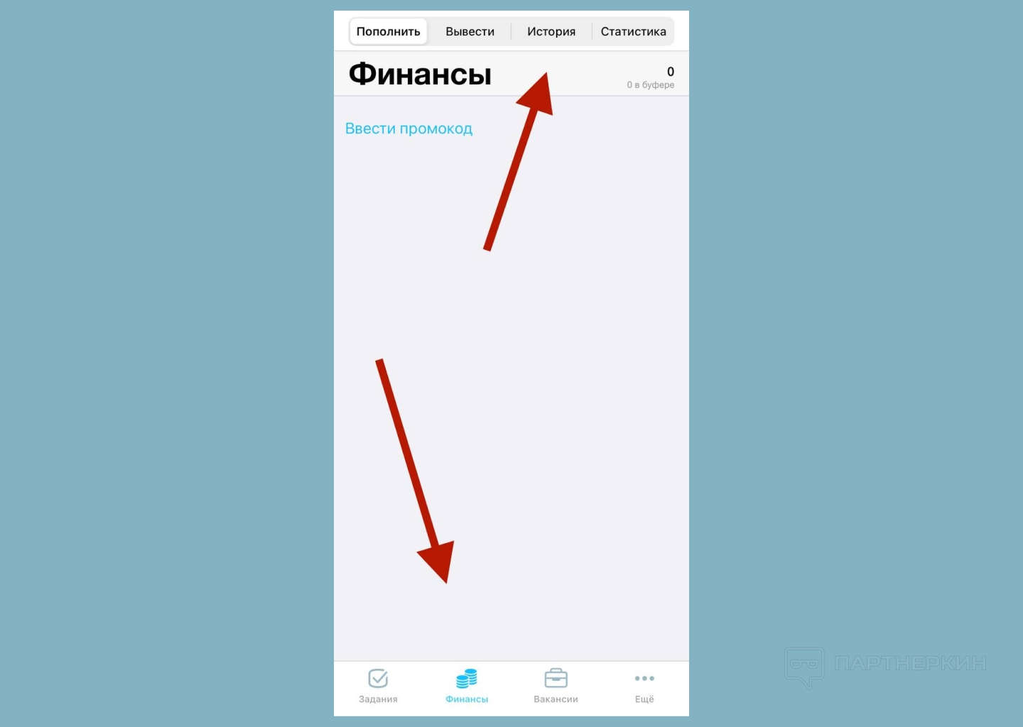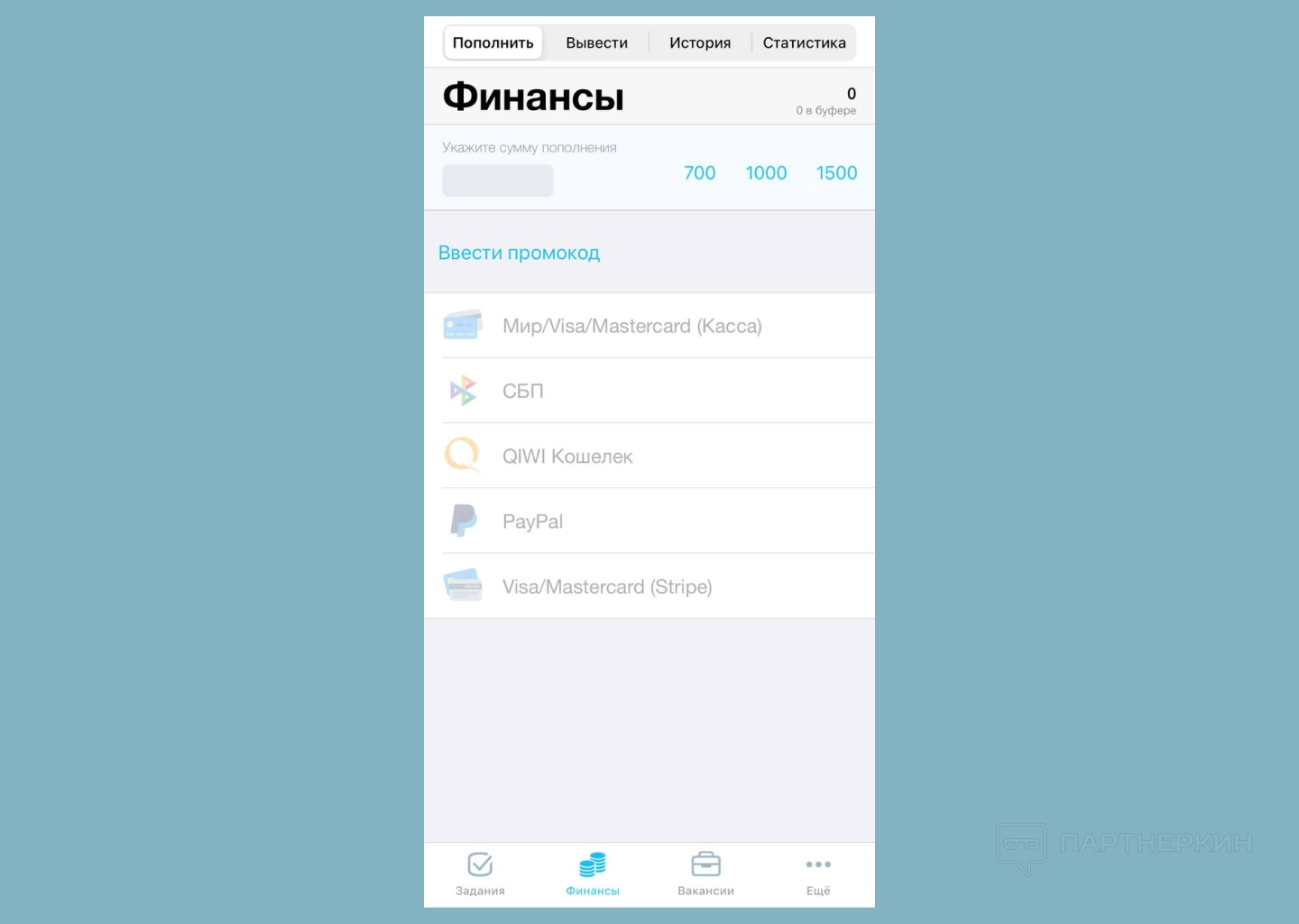 Помимо этого раздела, есть еще «Финансы». Там отображаются данные о состоянии счета пользователя — показывается общая сумма на счету. При этом здесь же можно пополнять счет, снимать средства с него, просматривать историю по платежам, а также статистику начислений. Также есть функция для ввода промокода, чтобы получить 100 рублей на счет.