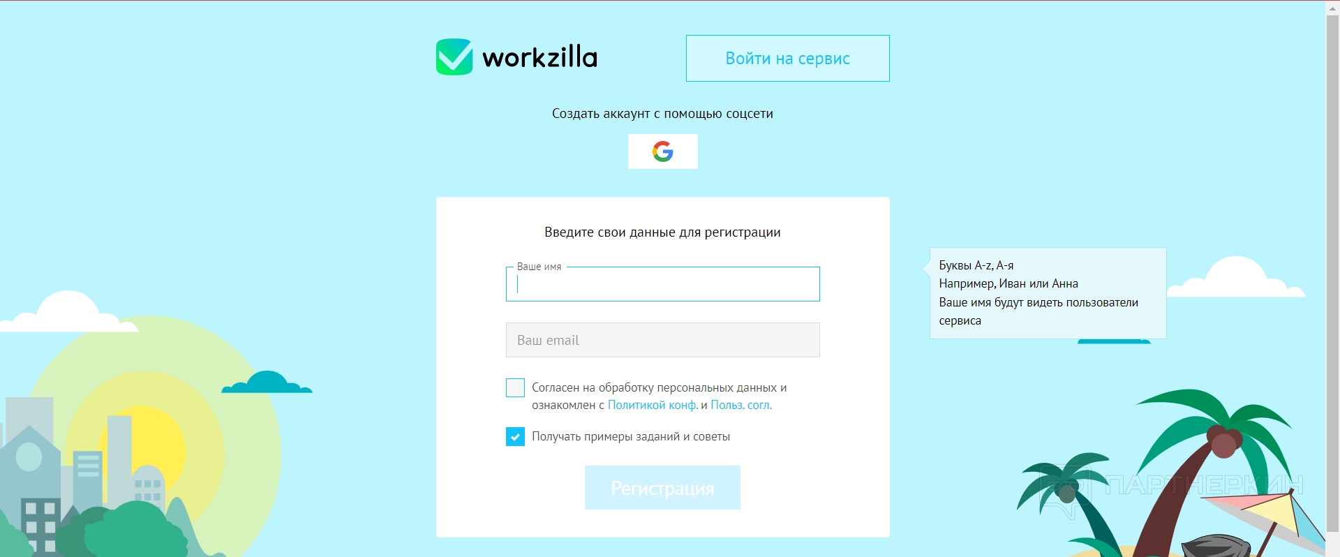 Чтобы зарегистрироваться в качестве исполнителя, нужно либо ввести свою почту и имя, либо авторизоваться через Google-почту.