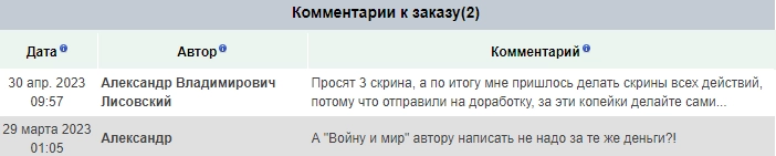 Внизу страницы отображаются комментарии к заказу. На скриншоте видно, что фрилансеров не устраивает низкая оплата.
