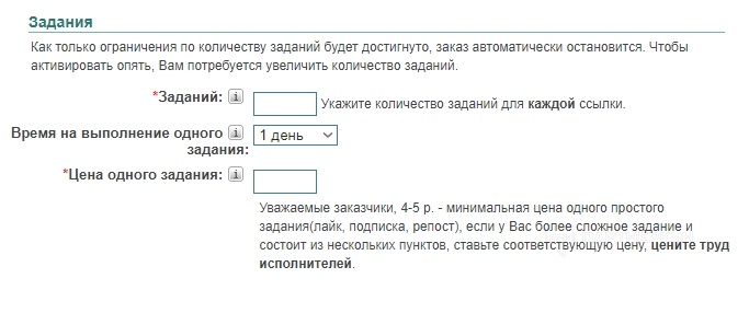 - Цена одного задания . Чем выше стоимость, тем больше исполнителей согласятся выполнить заказ. Минимальная цена одного простого задания (лайк, репост, подписка) составляет 4-5 рублей.