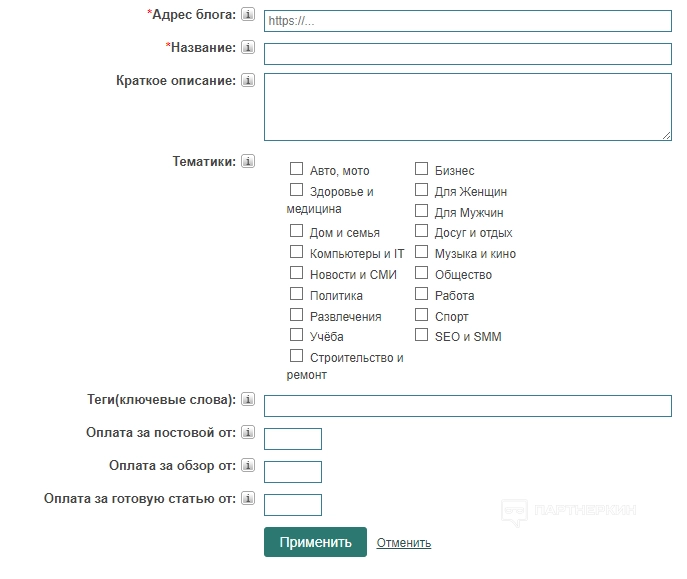 - теги (ключевые слова, которые характеризуют блог. Максимум пять тегов. Чем точнее будут прописаны ключевые слова, тем больше заказов для блога);