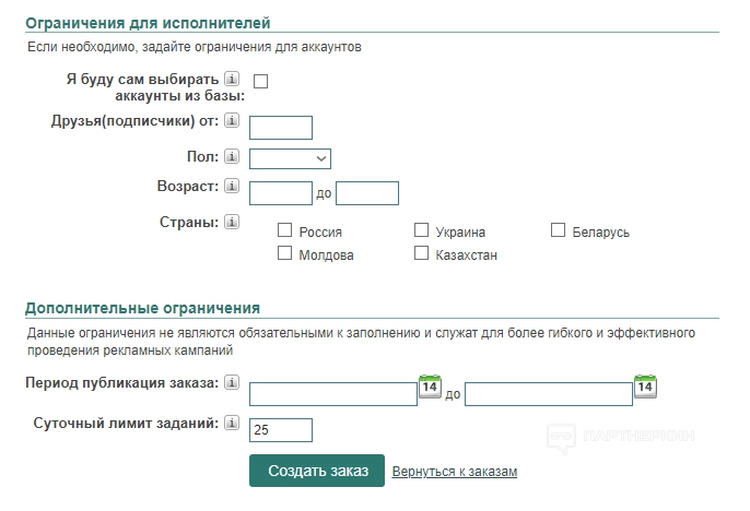 Клиенты могут создать заказ для форумов, блогов, социальных сетей, отзывов, Telegram, YouTube и «Яндекс». Рассмотрим пример создания задания для «ВКонтакте».