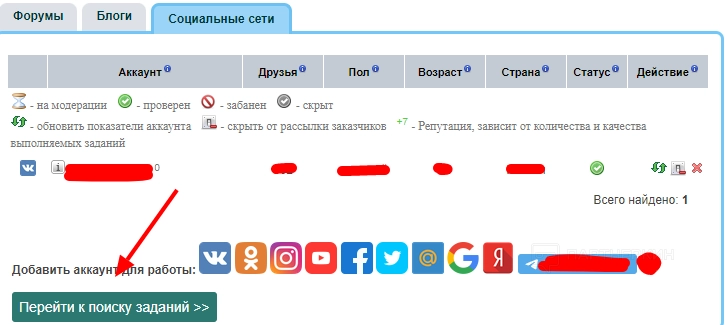 После добавления аккаунта пользователь может перейти к поиску заданий.