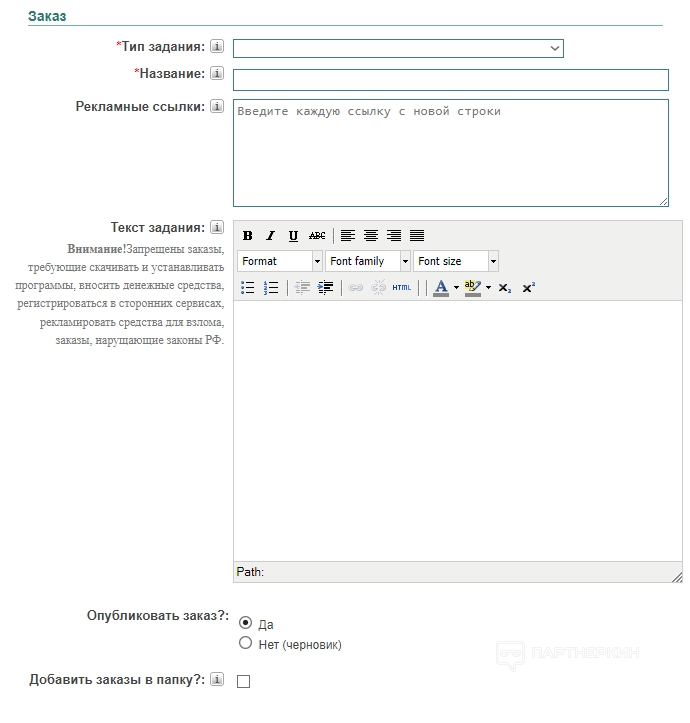 - Текст задания . В специальном поле нужно описать и поставить задачу для исполнителей. Важно: запрещены заказы, требующие скачать и устанавливать программы, вносить денежные средства, регистрироваться в сторонних сервисах, рекламировать средства для взлома и другие заказы, нарушающие законы Российской Федерации.