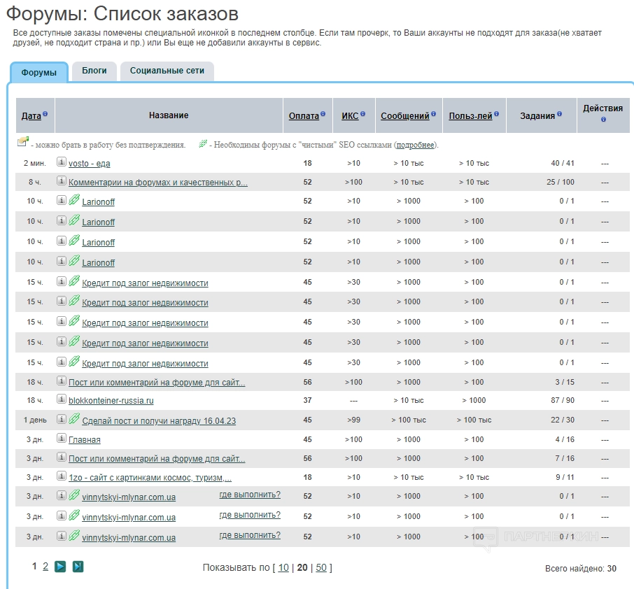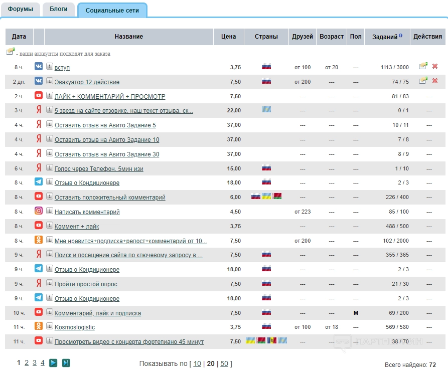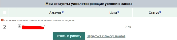 Откроется список заказов для работы. Все доступные задания помечены специальной иконкой в последнем столбце. Если там прочерк, то аккаунт фрилансера не подходит для заказа (например, у исполнителя недостаточно друзей).