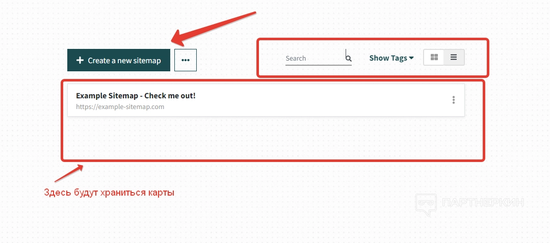 Стартовая страница редактора представляет собой хранилище, в котором будут отображаться созданные карты сайтов. Для поиска предусмотрена специальная строка, а также фильтр, позволяющий отбирать карты по названию, тегам и виду.