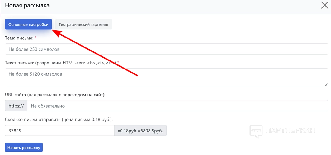 - В меню «Основные настройки» выберите: тему письма, напишите текст, введите URL (куда будет выполнен переход), количество писем. Ссылку на сайт указывать не обязательно.