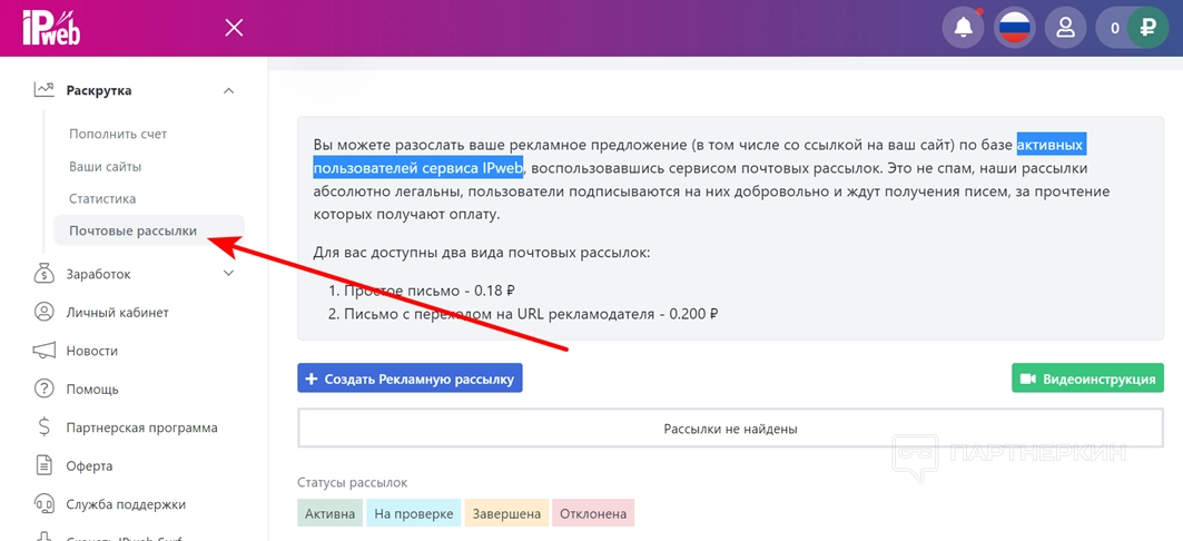 - Перейдите во вкладку «Почтовые рассылки».