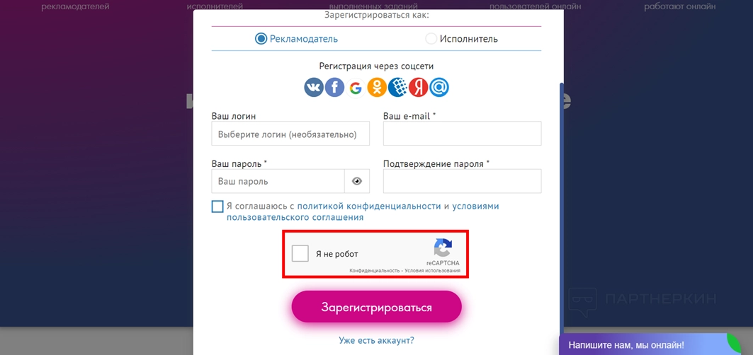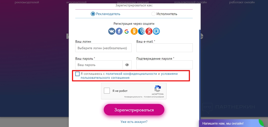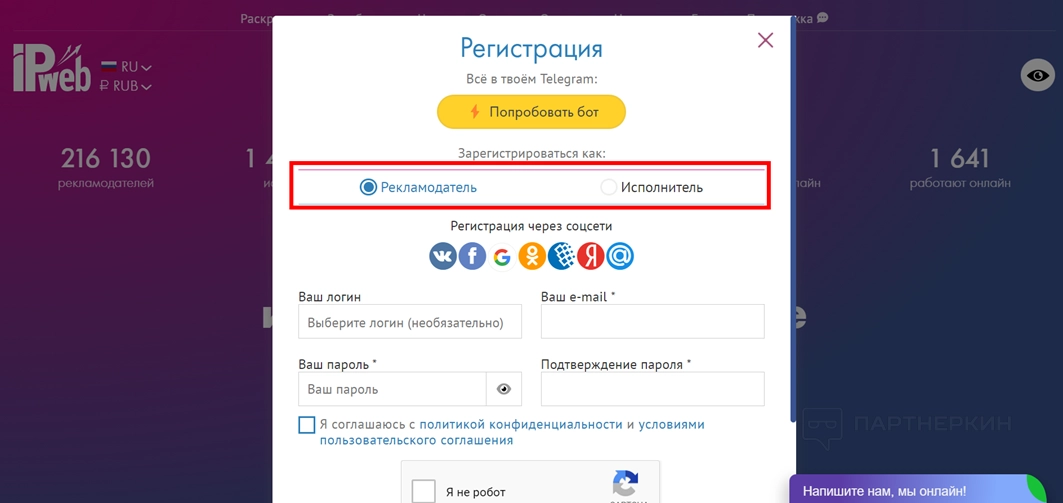 - Выберите, как хотите использовать ресурс: рекламодатель или исполнитель.