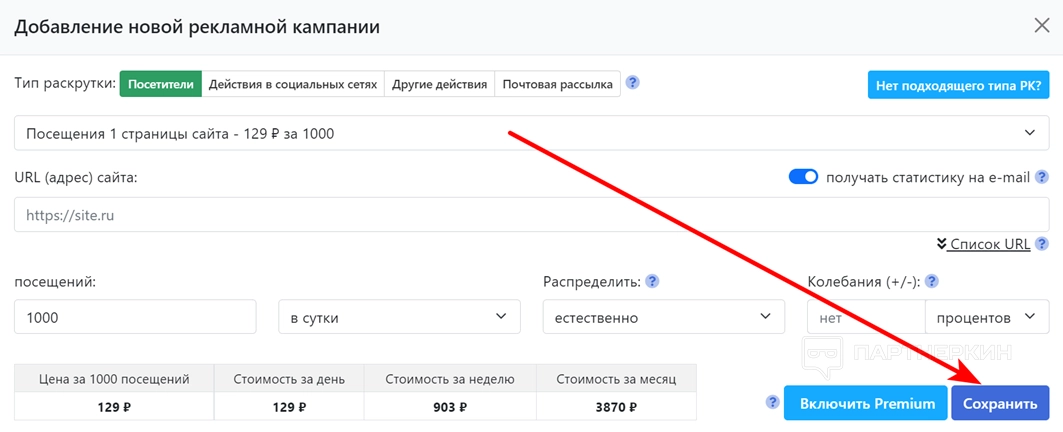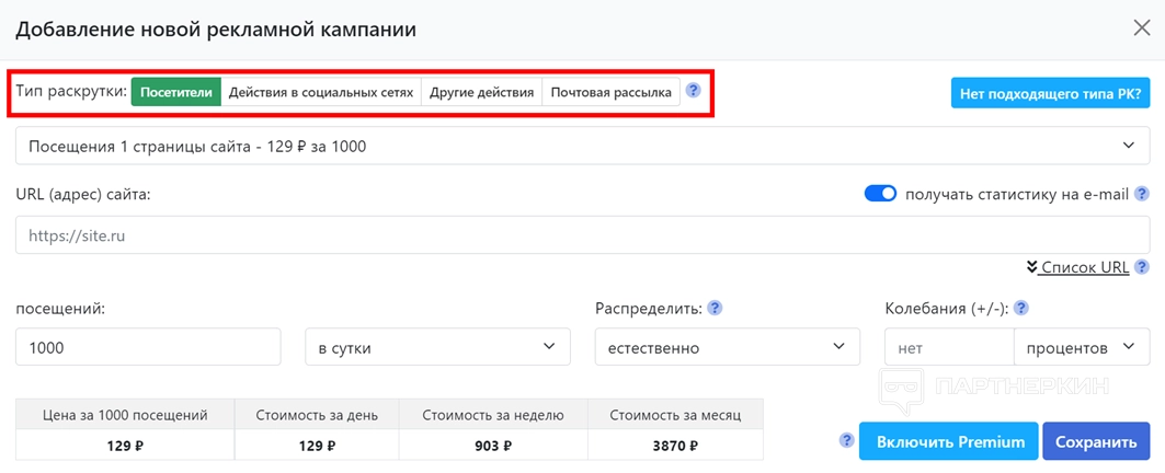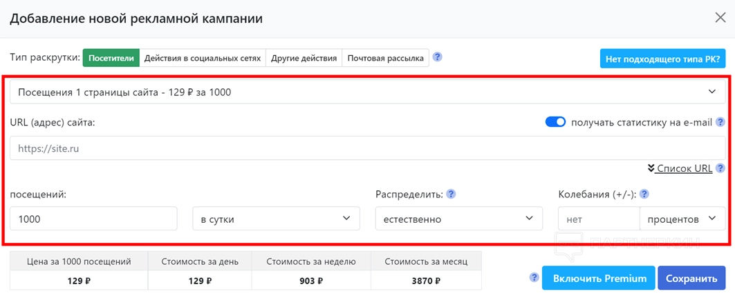 Внимание! Включив опцию Premium, стоимость накрутки увеличиться. Вместе с этим улучшатся показатели самой кампании.