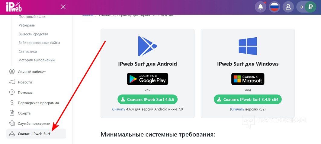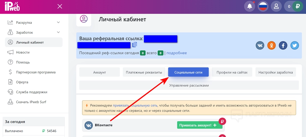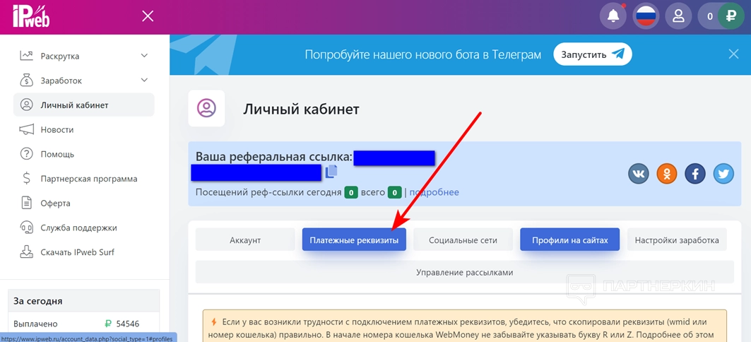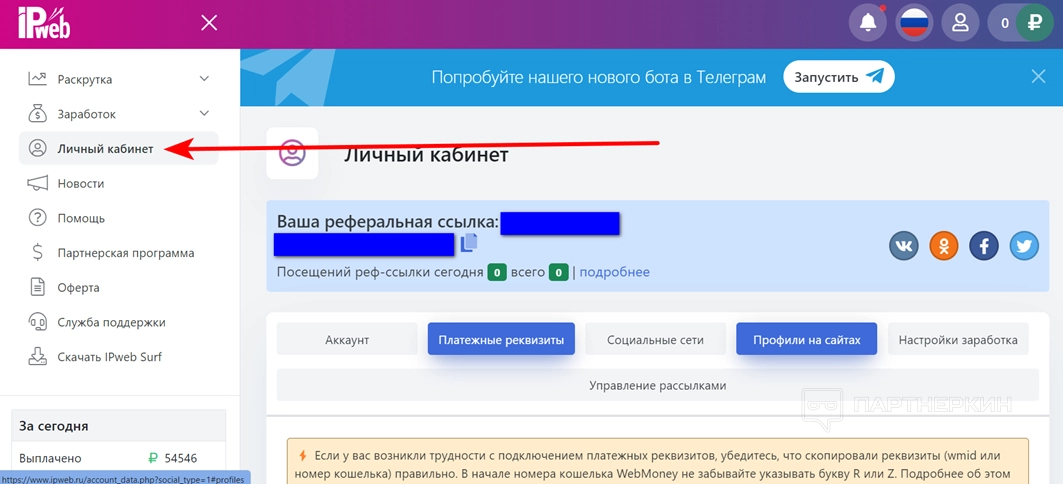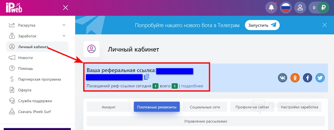 Внимание! Реферальная ссылка находится в разделе «Личный кабинет».