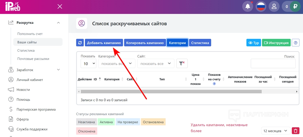 Для заказчиков и рекламодателей есть несколько видов продвижения. Инструменты находятся в разделе «Раскрутка». Для заказа рекламы пополните баланс и привяжите сайт (аккаунт, e-mail и так далее), который нужно продвигать.