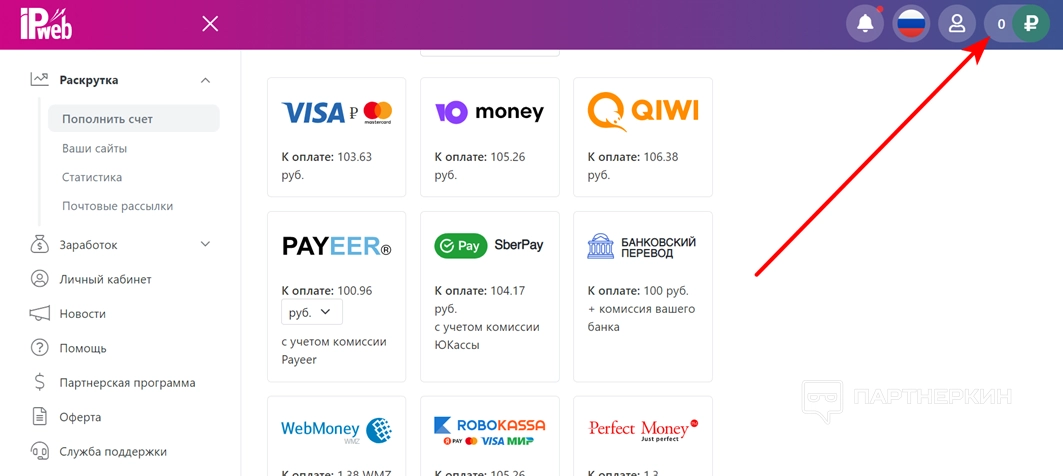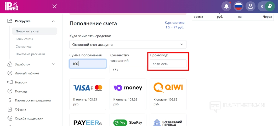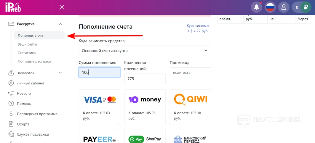 - В меню «Раскрутка» выберите пункт «Пополнить счет».