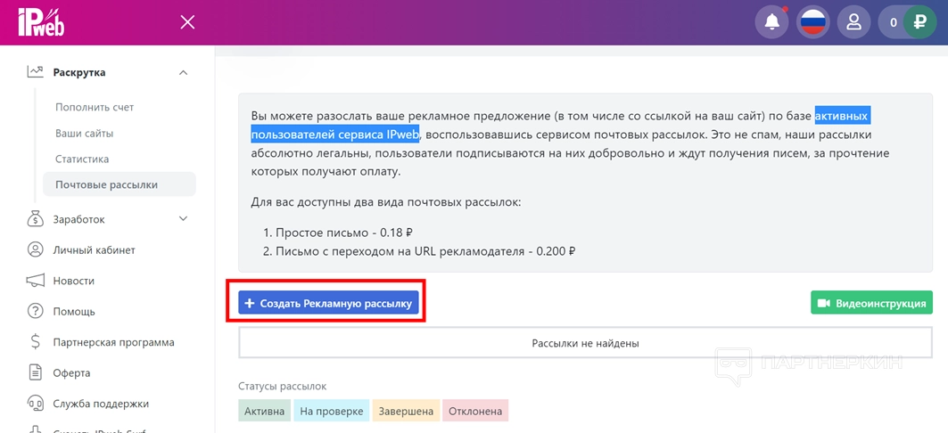 - Нажмите на кнопку «Создать рекламную рассылку».