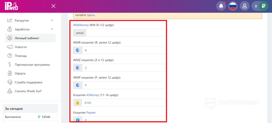 - Укажите номер кошелька или банковской карты, куда будут зачисляться средства.