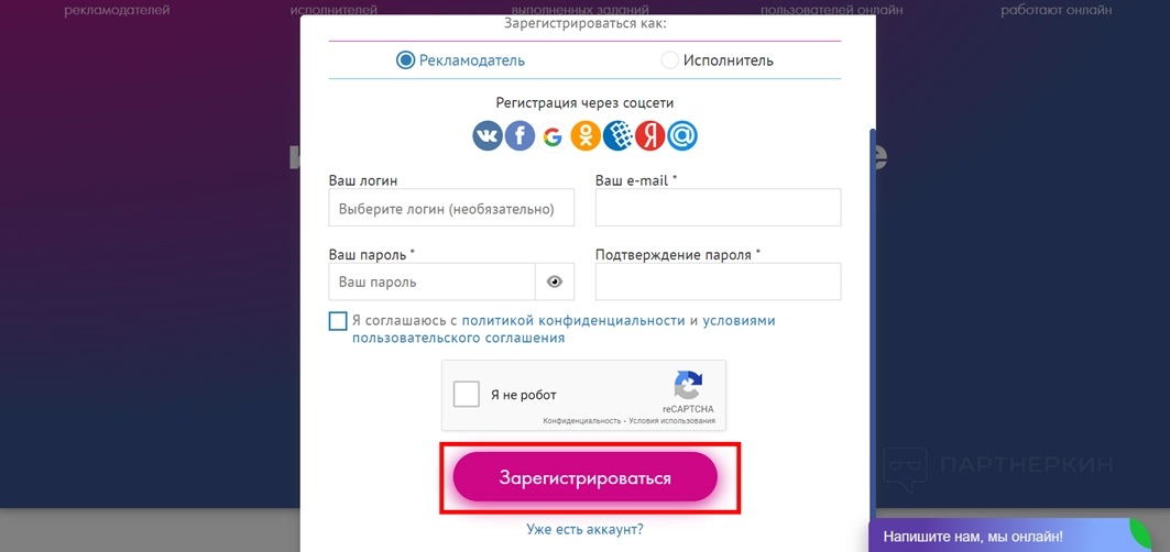 Для начинающих рекламодателей предусмотрена система бесплатного продвижения сайта. Заказчики могут стать исполнителями. Для этого нужен «живой» аккаунт в социальных сетях и номер платежных реквизитов.