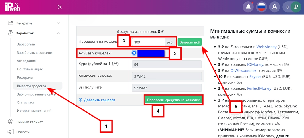 - Укажите сумму, которую нужно вывести (3).