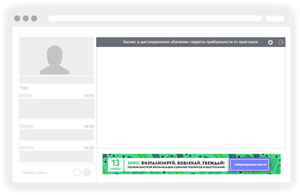 - Широкий чат . Подходит для масштабных презентаций с рекламой продукта. Дизайн выполнен в таком виде, чтобы спикер смог проводить презентацию, общаться с участниками и показывать на отдельном экране специфический контент.