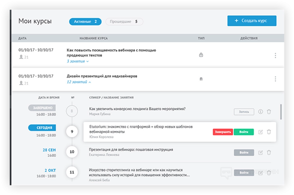 Платформа дает возможность настроить трансляцию под конкретные запросы. Стандартный тип — это разовый вебинар. Спикер создает конференцию и проводит трансляцию. Вебинар не привязан к циклам или сериям.