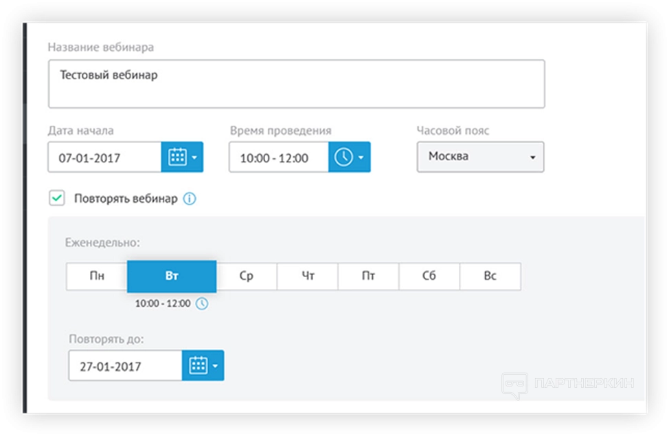- Серия . С помощью конструктора администратор создает несколько занятий, которые привязаны к конкретной дате. Новые участники регистрируются на все курсы одновременно. Все вебинары будут доступны по одной ссылке. Можно подвязать на конкретные занятия только определенных участников.
