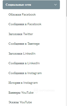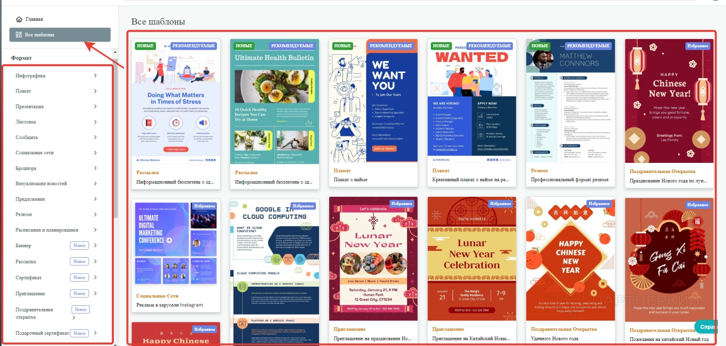 Самый главный раздел — «Шаблоны». В нем содержатся все необходимые для создания креативов шаблоны, отличающиеся по формату и тематике. Сервис поддерживает следующие форматы шаблонов:
