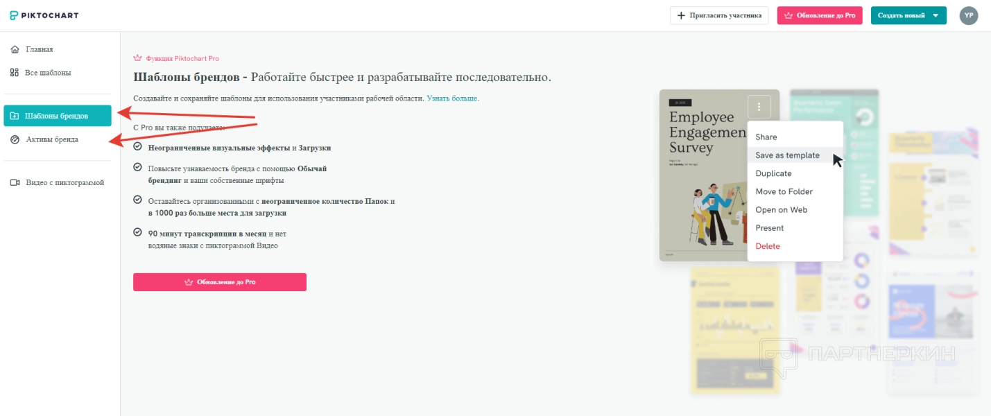 Далее в панели управления идут разделы «Шаблоны бренда» и «Активы бренда», доступ к которым откроется после приобретения платной подписки. Первый раздел позволяет выполнять более гибкую настройку поддерживаемых шаблонов. То есть пользователь может выбирать точные размеры, добавлять собственные элементы, работать с другими тематиками и так далее. Также Что касается второго раздела, в нем открывается доступ к новым цветам, шрифтам.