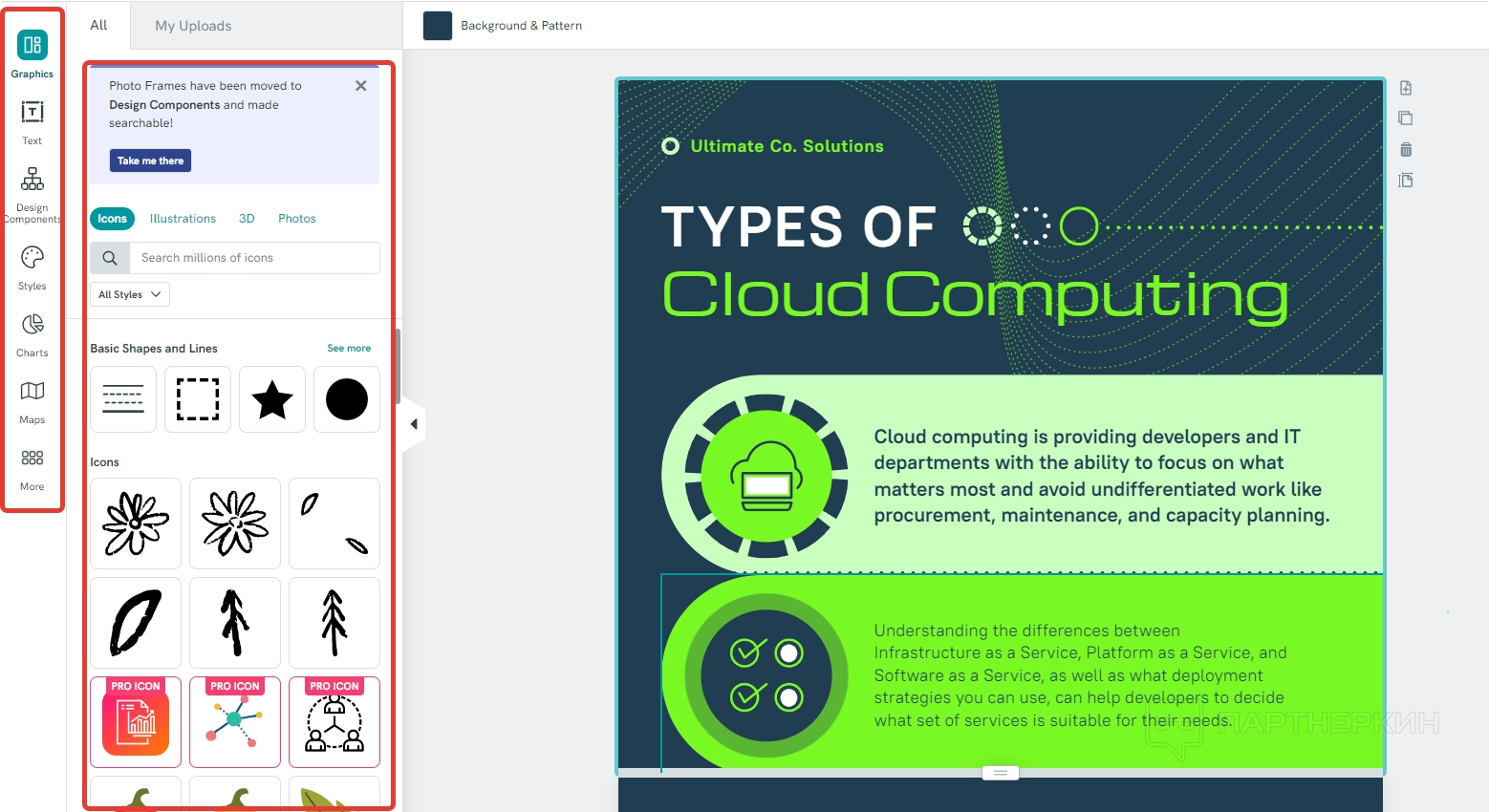 После этого сервис подгрузит выбранный шаблон в рабочем пространстве и отобразит все доступные инструменты и графические элементы в левой части экрана.