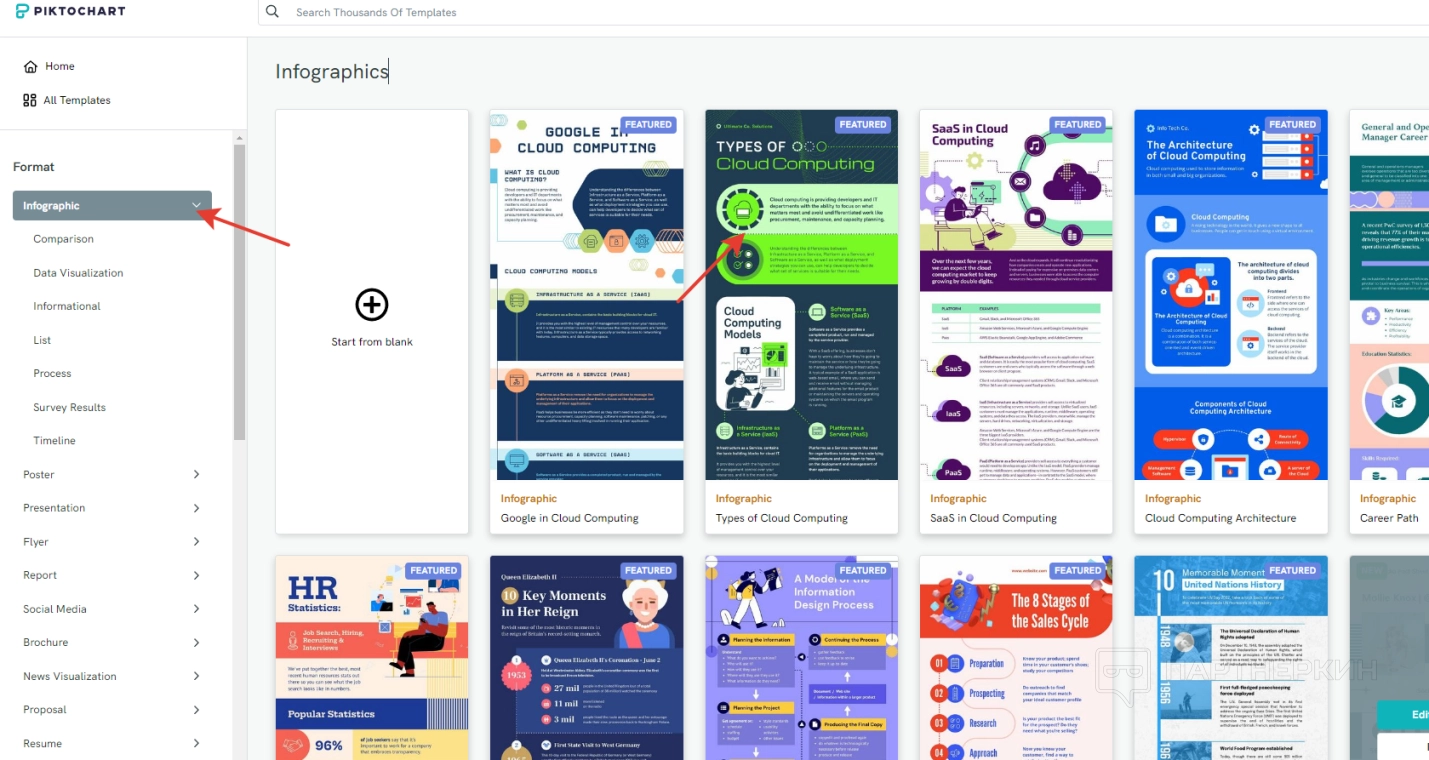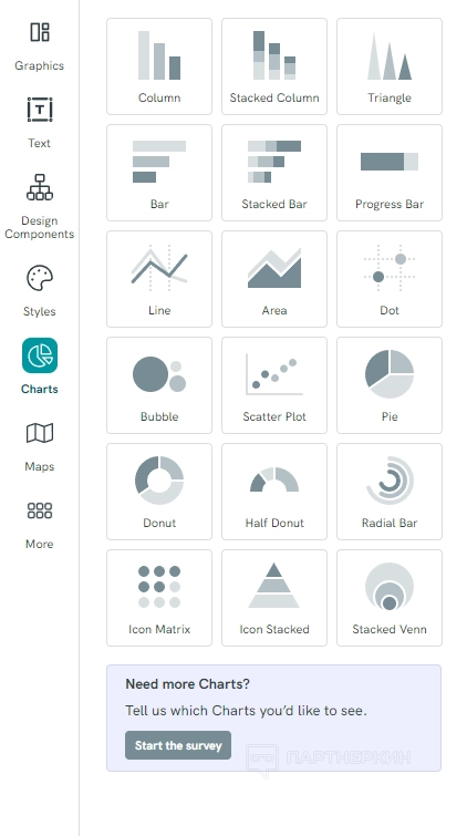 В разделе «Graphics» отображаются все бесплатные графические элементы, которые можно добавлять в шаблон. В «Text» выбирается шрифт и регулируется его размер. Также стоит отметить «Styles», где можно выбирать и менять цветовые схемы. Еще один важный блок – «Charts». Тут можно найти все необходимые атрибуты для создания инфографики.